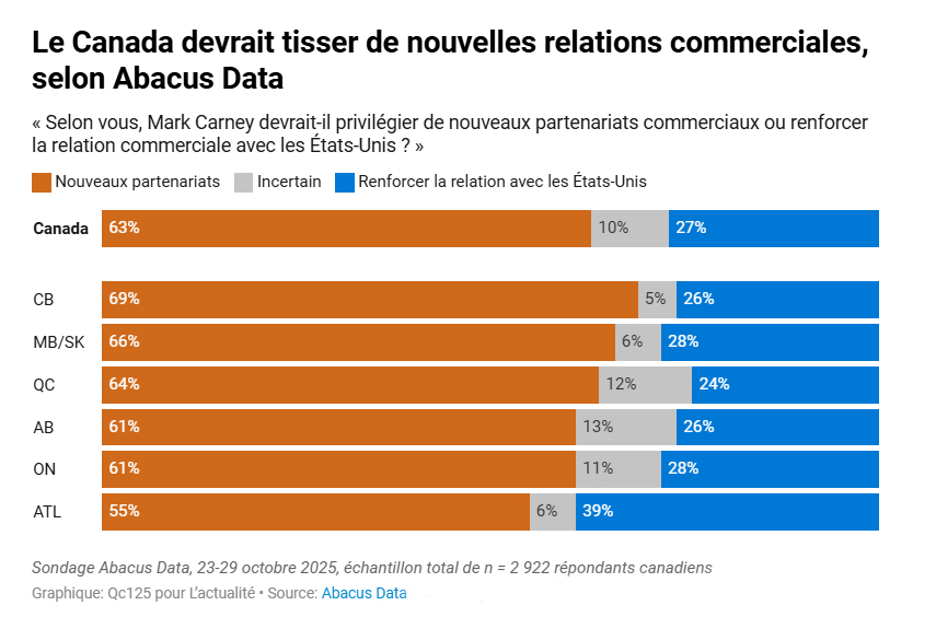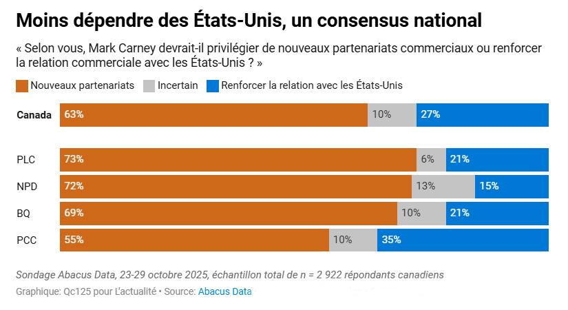 Rezultatele sondajului Abacus arată că, indiferent de regiune sau de orientarea politică, canadienii susțin necesitatea diversificării partenerilor comerciali ai țării, chiar dacă acest lucru ar însemna o încetinire temporară a creșterii economice. Sondajul arată că de două ori mai mulți respondenți favorizează căutarea de noi aliați comerciali decât întărirea relațiilor cu Statele Unite. Două treimi dintre cei chestionați (63%) consideră că primul ministru ar trebui să dezvolte parteneriate noi, în timp ce doar 27% cred că ar trebui consolidate relațiile economice cu vecinii de la sud.