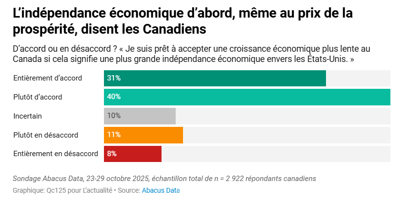 Sondajul Abacus mai arată că o mare parte a populației este pregătită să accepte o încetinire economică în schimbul unei mai mari independențe față de SUA: 31% dintre respondenți sunt „total de acord” și 40% „mai degrabă de acord” cu această idee. În Quebec, procentul celor dispuși la un astfel de sacrificiu urcă la 76%. Doar o minoritate (15%), mai ales printre alegătorii conservatori, se opune acestei abordări.