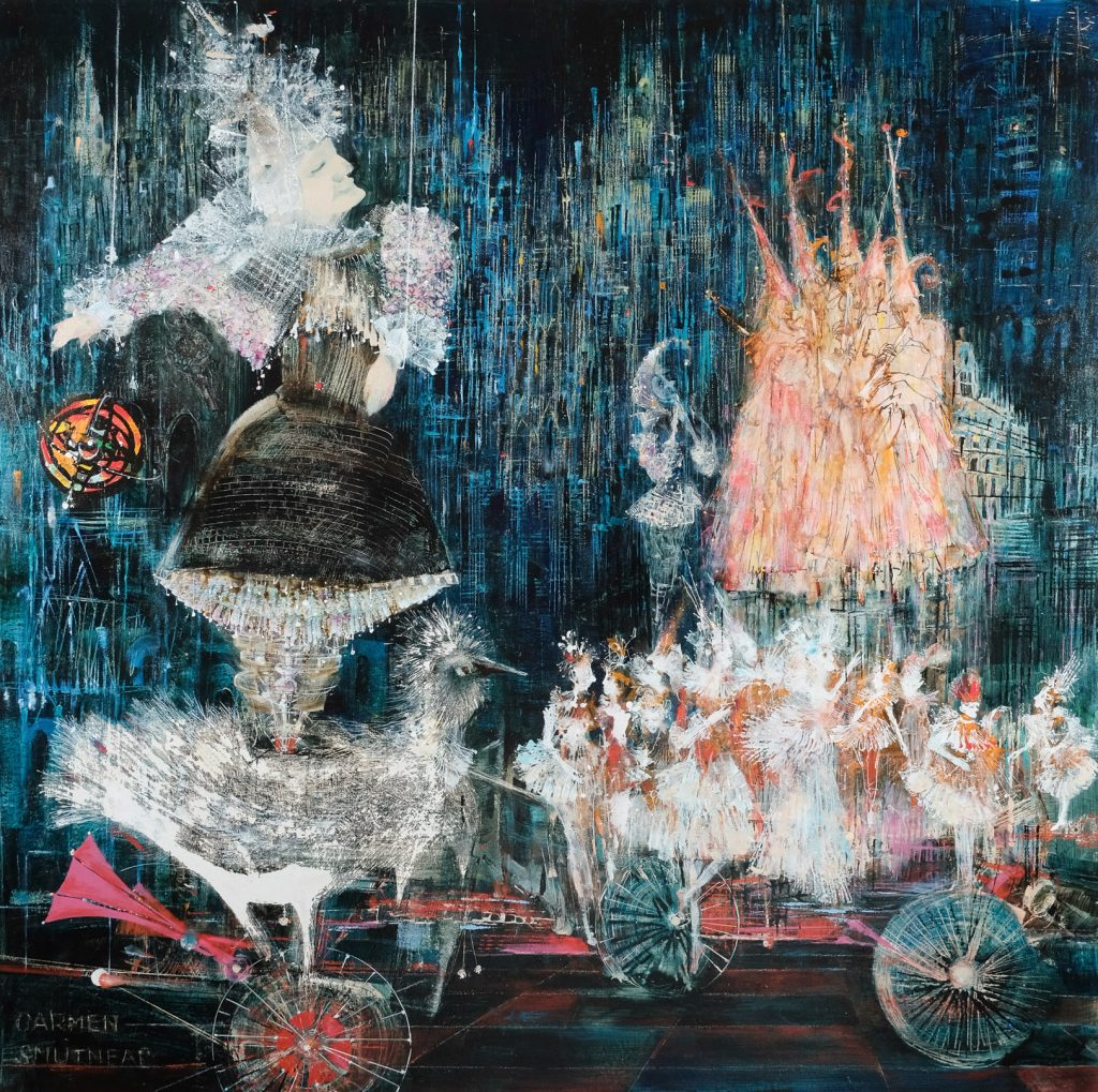 Carmen Smutneac: Sunt profund fascinată de Timp. Pentru mine, el este deopotrivă dușman, refugiu și aliat, pentru că refuză să fie redus la o singură definiție. Se desfășoară ca o succesiune de imagini și simboluri, asemenea unei parade circulare, așa cum am evocat în expoziția Caruselul Timpului. Personajele, detaliile și semnele se împletesc peste epoci, iar caruselul devine simbolul rotației eterne, al ciclului nesfârșit.
