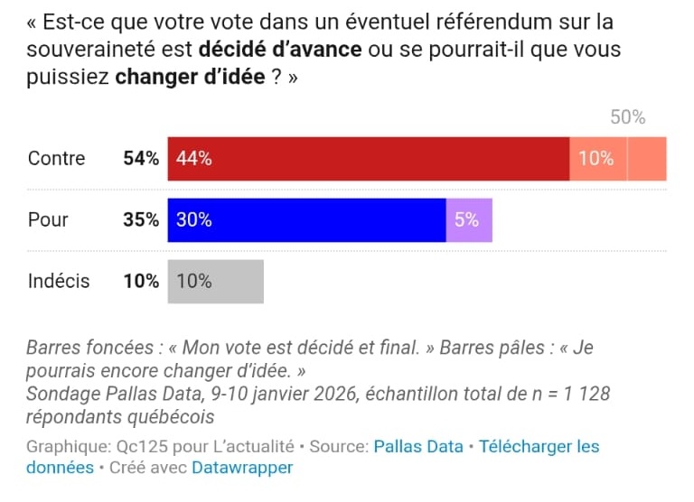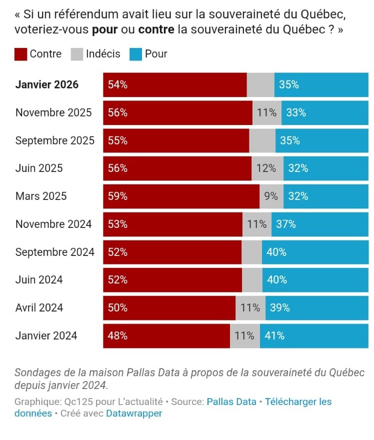 Potrivit unui sondaj Pallas Data realizat pentru revista L’actualité, la întrebarea: „Dacă ar avea loc un referendum privind suveranitatea Quebecului, ați vota PENTRU sau ÎMPOTRIVA suveranității?”, rezultatele înclină fără echivoc de partea taberei ÎMPOTRIVĂ.