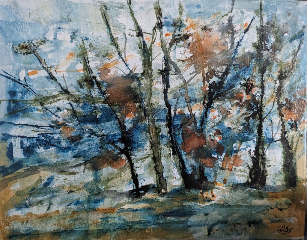 Toamna a fost la fel de prolifică. În cadrul Expoziției de toamnă a Beaconsfield Artists Association (3–5 octombrie), Doina Falcon a obținut locul al doilea pentru lucrarea Before Spring, realizată în tehnică mixtă de acuarelă pe pânză. „Înainte de primăvară surprinde frumusețea liniștită a acestui moment în natură, unde copacii stau ca niște santinele pe fundalul luminii care se estompează”, mărturisește artista. „Albastrul și maroul evocă un sentiment de calm și pământesc, în timp ce atingerile de portocaliu sugerează căldura persistentă a apusului”, adaugă ea, explicând jocul cromatic atent ales pentru a crea echilibrul între liniște și căldura vizuală.