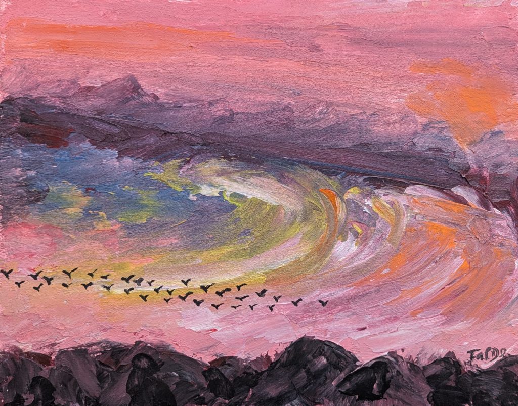 Anul se va încheia cu o notă personală: în perioada 12 decembrie 2025 – 16 ianuarie 2026, artista își va prezenta expoziția solo Petits tableaux la Centre des loisirs VMR (60 av. Roosevelt, Mont-Royal, H3R 1Z4). Printre lucrările expuse se va regăsi și Coucher de soleil avec oiseaux, o lucrare recentă, acrilic pe lemn, ce explorează lumina apusului printr-un limbaj cromatic cald și subtil.