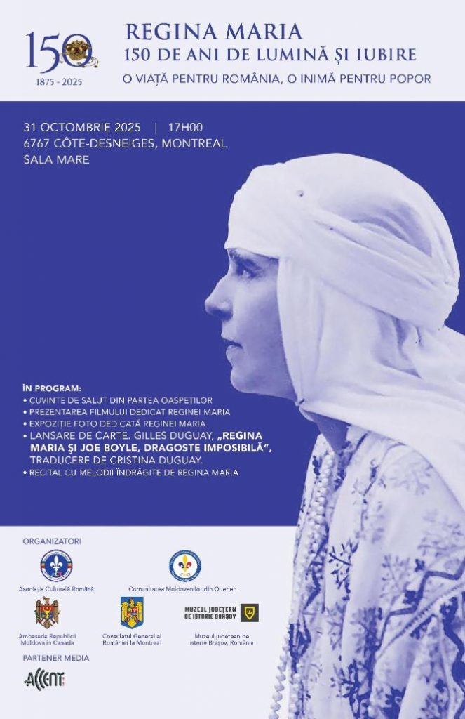 Evenimentul „Regina Maria – 150 de ani de lumină și iubire” va avea loc în Sala Mare a Centrului comunitar 6767 Côte-des-Neiges, începând cu ora 17:00. Pe lângă această lansare de carte, programul include o expoziție fotografică cu imagini rare, oferită de Muzeul Județean de Istorie din Brașov, o expoziție de costume populare autentice, pusă la dispoziție de consulul general al României la Montreal, Tullia Balla, proiecția unui film documentar dedicat vieții și operei Reginei Maria, precum și un recital de muzică românească, cu melodii îndrăgite de regină. Intrarea este liberă.