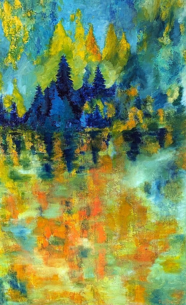 Doina Falcon expune tabloul de mari dimensiuni Éclat (Strălucire, 122×91 cm), realizat în ulei, care întruchipează o explozie de emoții pe pânză. Amestecul turbionar de galben, portocaliu, albastru și verde sugerează un peisaj eteric, aproape de vis. Jocul de lumini și umbre seamănă cu un dans sălbatic de culori: galbenul și portocaliul strălucesc precum lumina caldă a soarelui filtrată printre copaci, în timp ce albastrul și verdele adaugă o profunzime misterioasă. Copacii în albastru închis se detașează pe fundalul nuanțelor strălucitoare, intensificând contrastul și reliefând cromatica vibrantă a tabloului.
