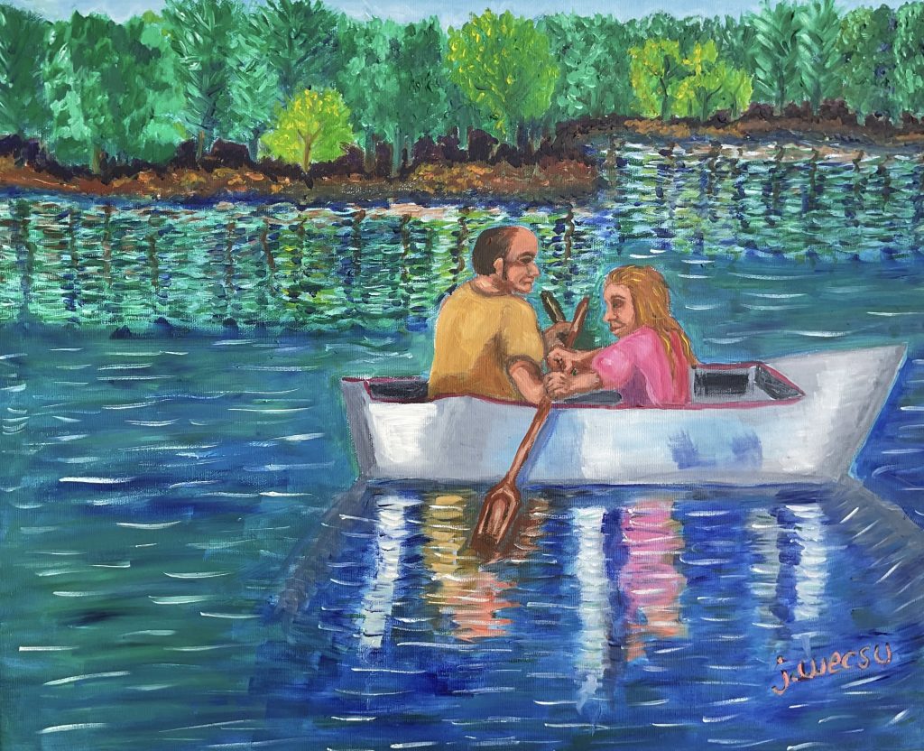 „Tabloul meu descrie o după-masă în parcul Mont-Royal. Un cuplu aflat în șalupă se leagănă nestingherit pe apă, efect care produce o undă de reflecție pe lac”, își prezintă lucrarea Josette Wecsu, subliniind serenitatea momentului și fascinația pentru dialogul subtil dintre lumină, mișcare și reflexia apei.