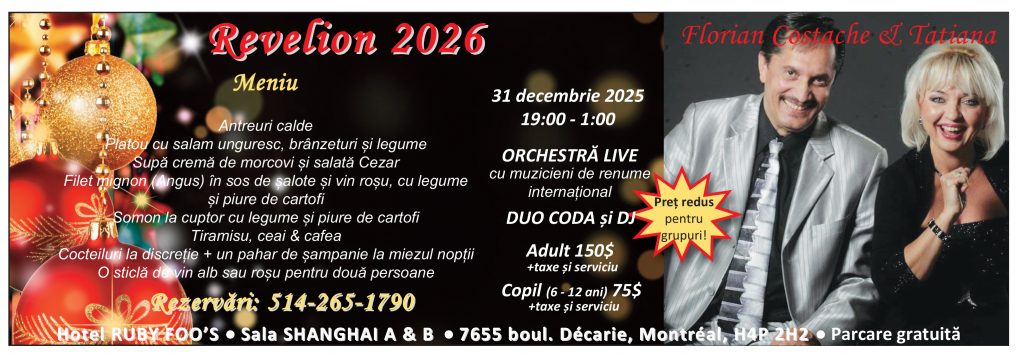 Așadar, dacă doriți să întâmpinați Noul An într-o atmosferă sofisticată și plină de farmec, cu muzică live de excepție oferită de Florian Costache, sunați la 514-265-1790 și rezervați-vă locurile!