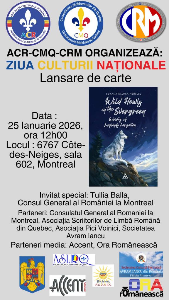 Duminică, 25 ianuarie, comunitatea românească din Montreal este invitată să celebreze bogata moștenire culturală a României, în cadrul unui eveniment dedicat Zilei Culturii Naționale. Manifestarea, devenită deja o tradiție a ultimilor ani prin colaborarea strânsă dintre Asociația Culturală Română (ACR), Comunitatea Moldovenilor din Quebec (CMQ) și Comunitatea Română din Montérégie (CRM), va avea loc începând cu ora 12:00, la Centrul Comunitar 6767 Côte-des-Neiges, sala 602.
